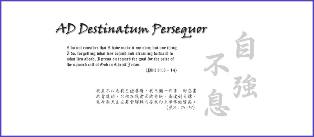 Our motto of "Ad Destinatum Persequor" (自強不息) is to inspire our students to stride unceasingly for self-enhancement. Inculcating this spirit of life-time learning will put them in good stead in a future, where knowledge will get superseded quickly by fast changing technological and social changes. This spirit is also vital in empowering the last, the least and the lost to realise their potential.